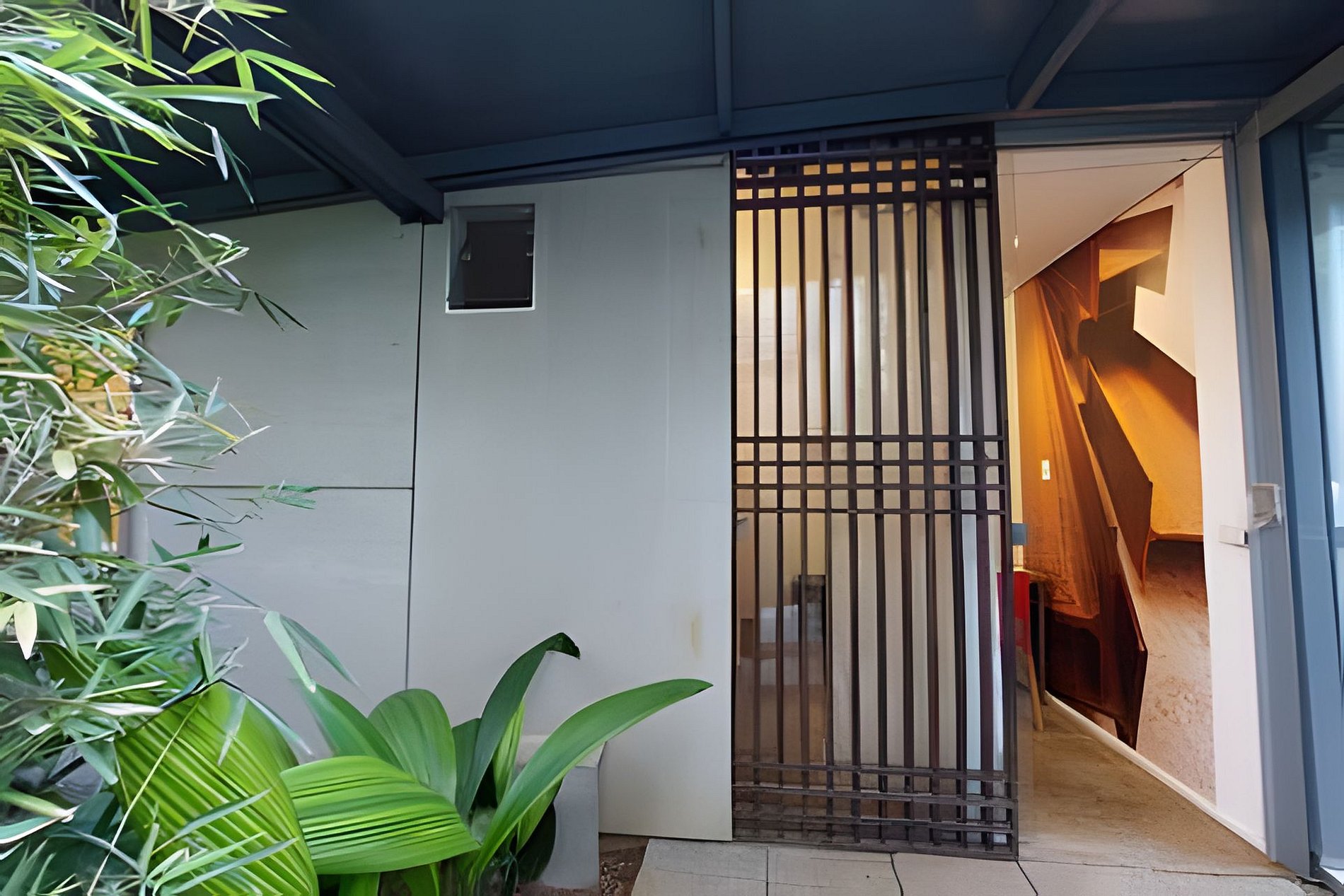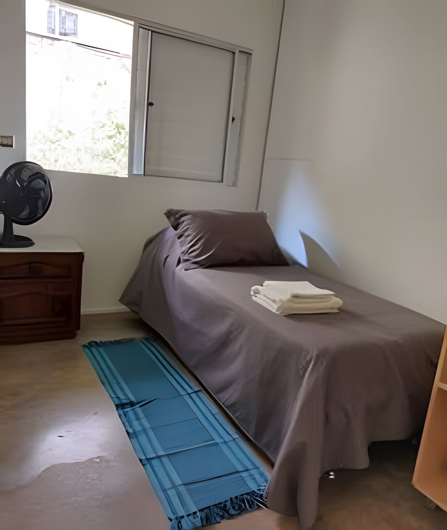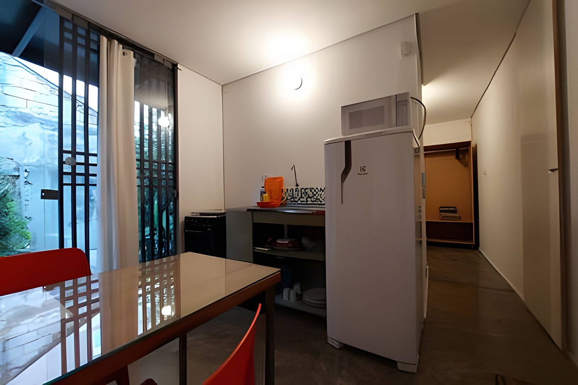 Circulação comum e apartamento com quarto, banheiro e cozinha privativos.