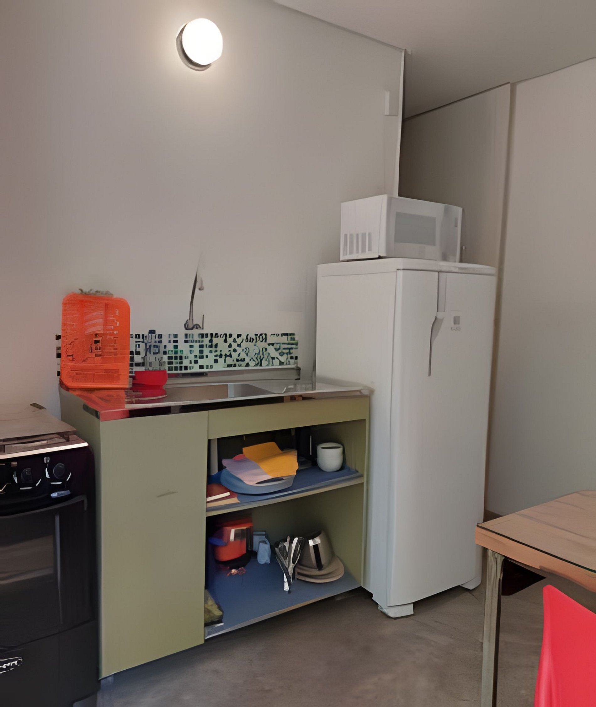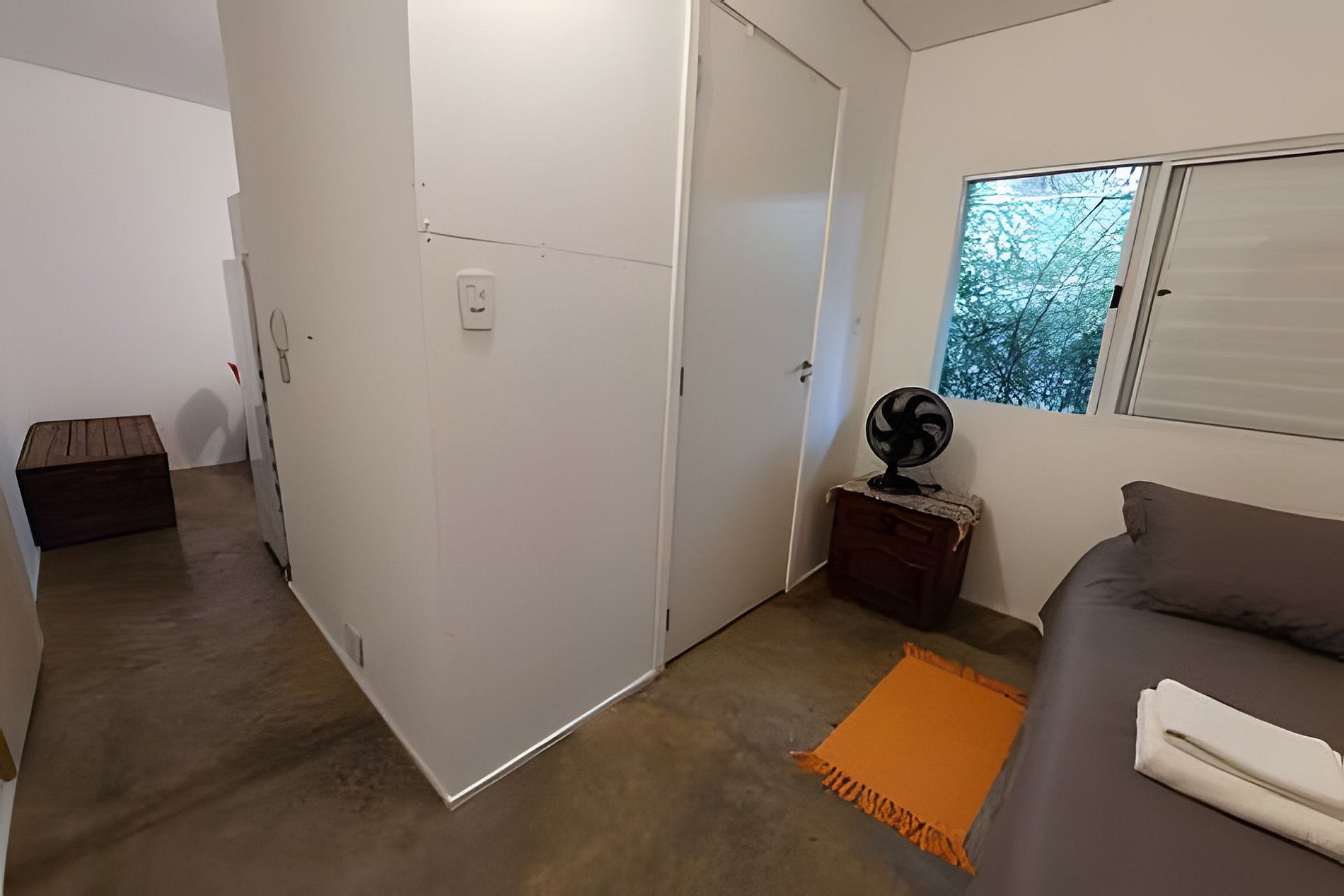 Circulação comum e apartamento com quarto, banheiro e cozinha privativos.