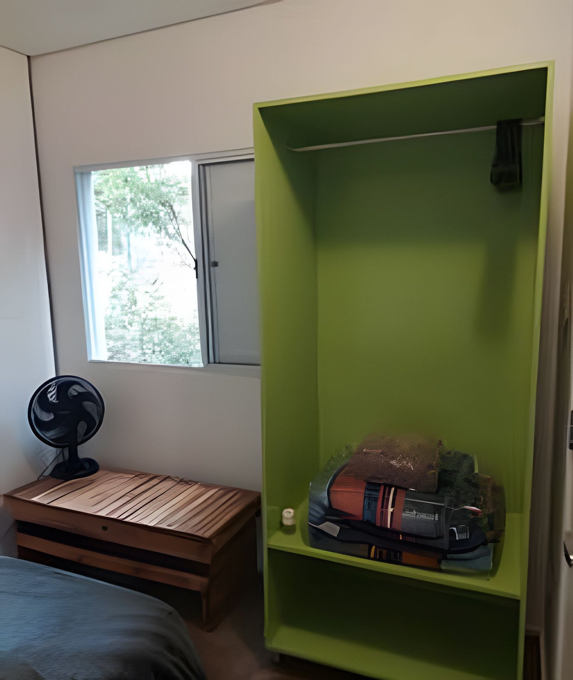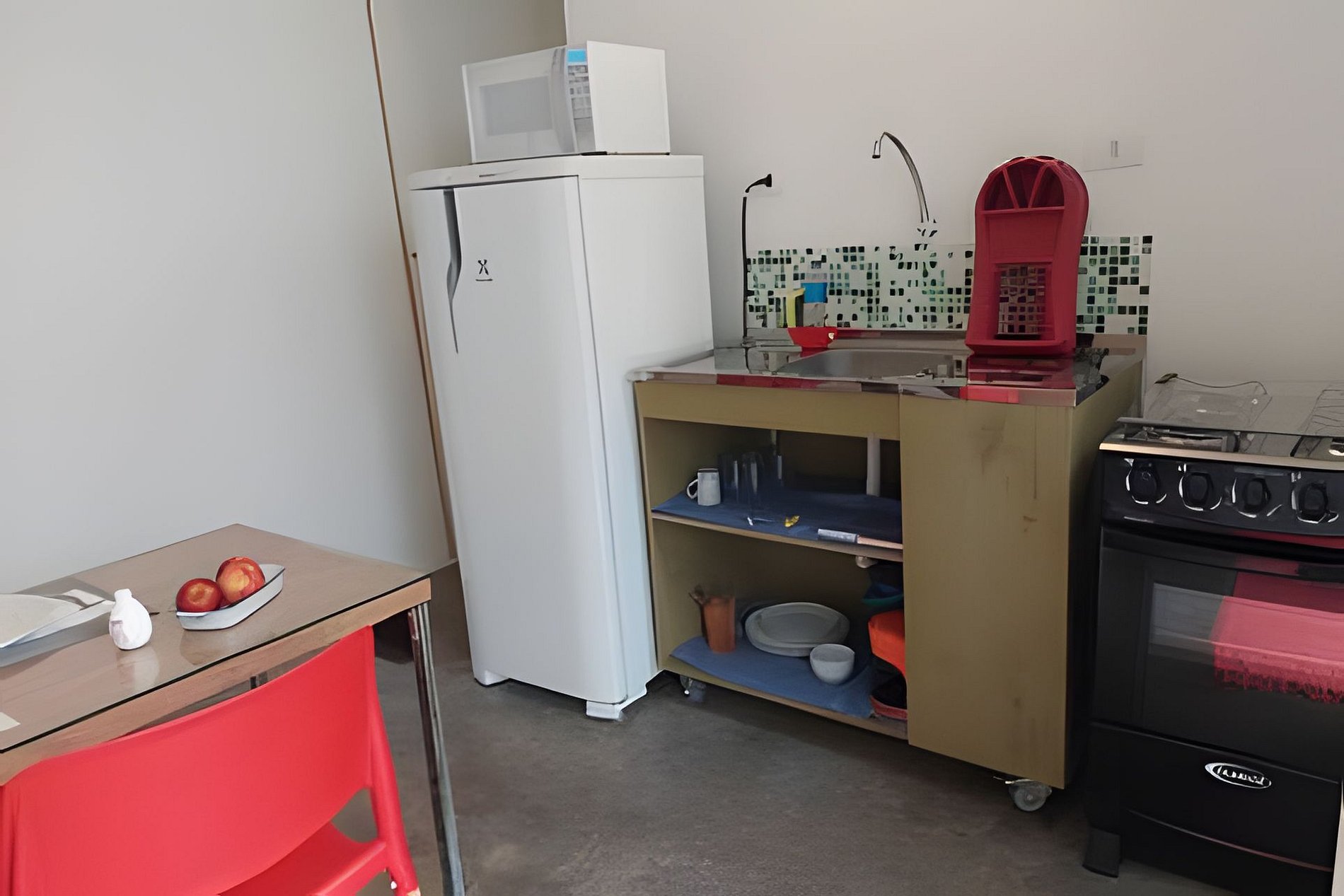 Circulação comum e apartamento com quarto, banheiro e cozinha privativos.