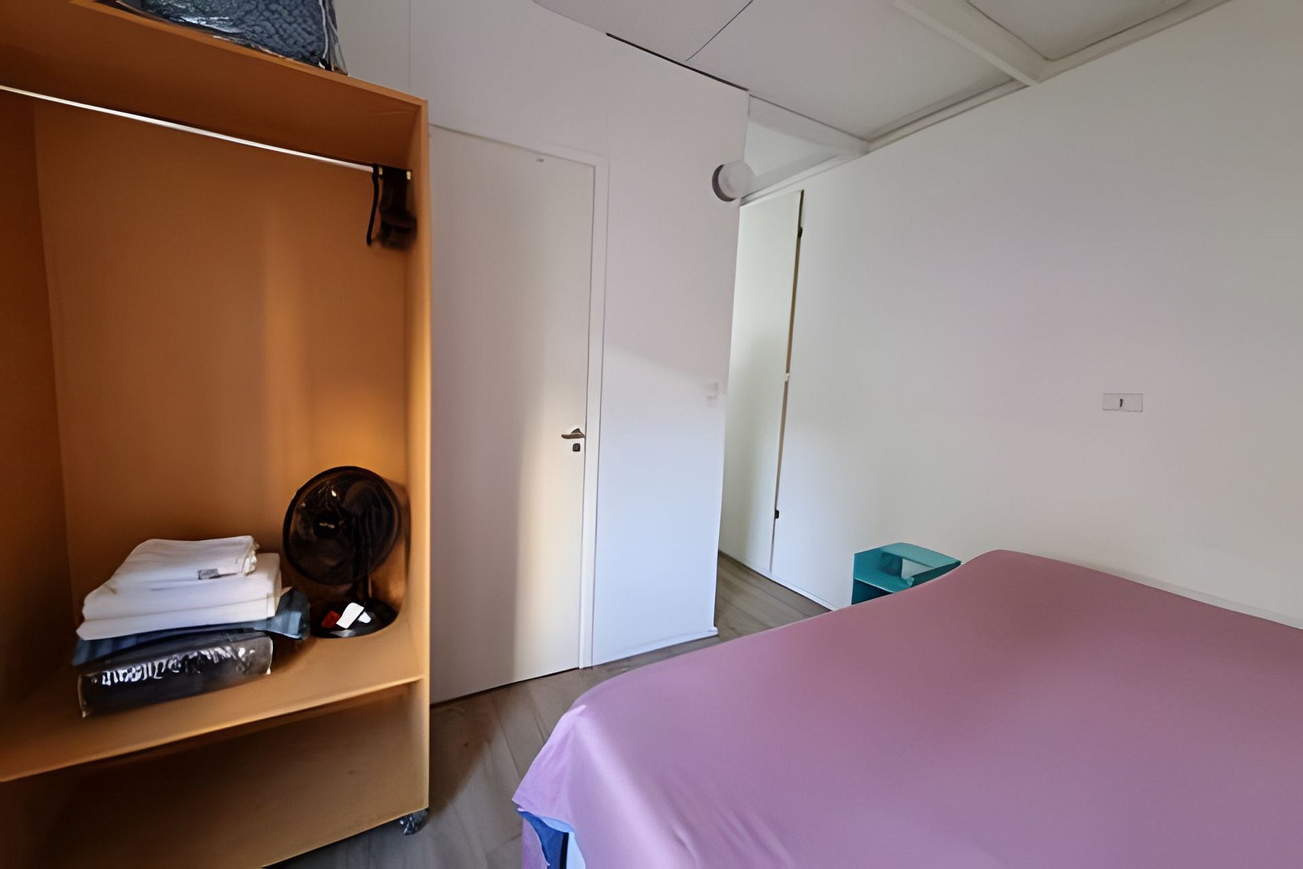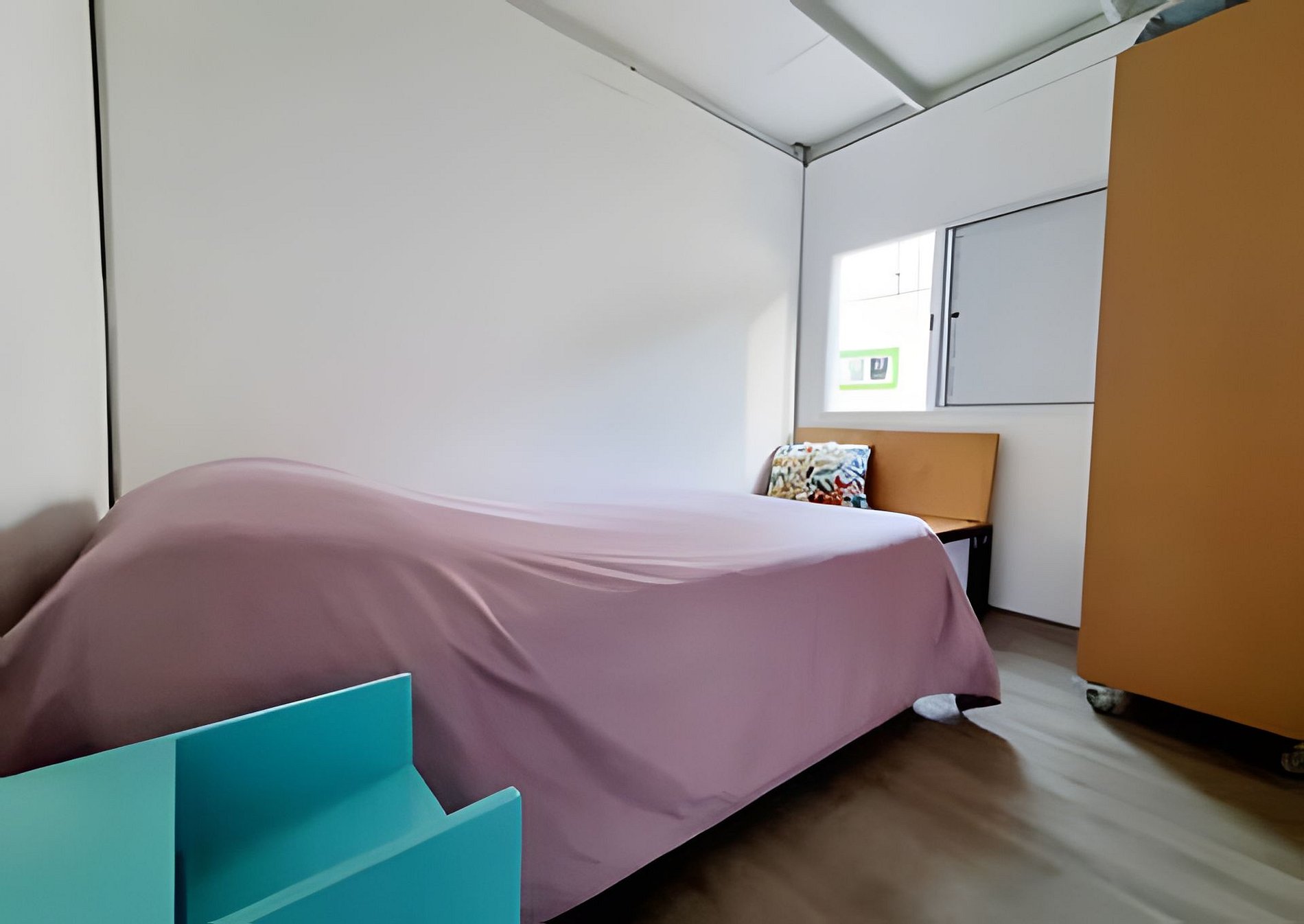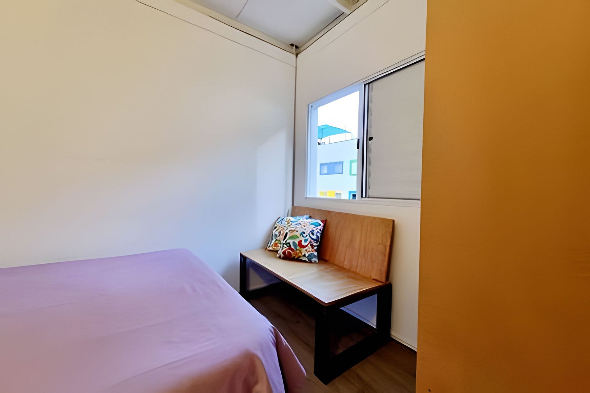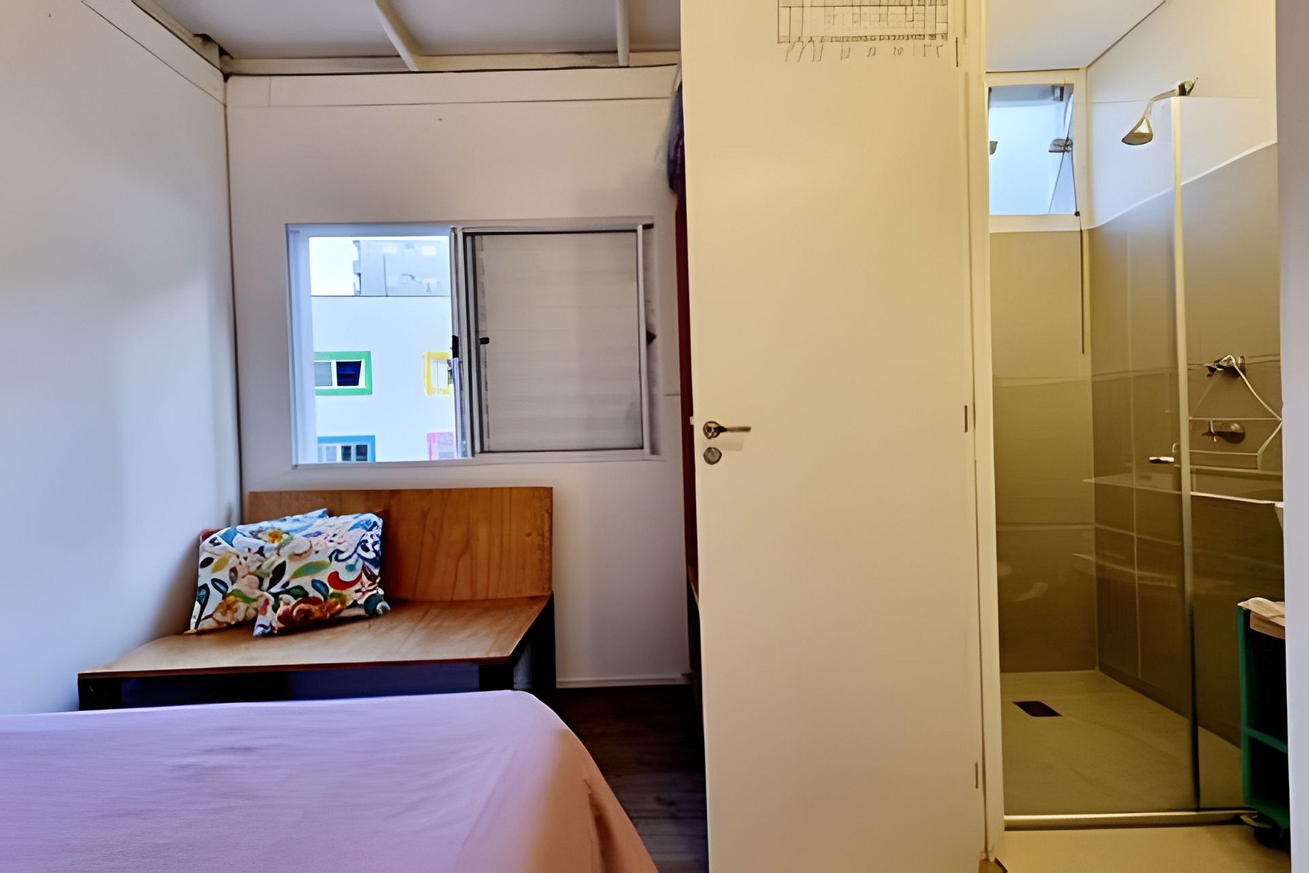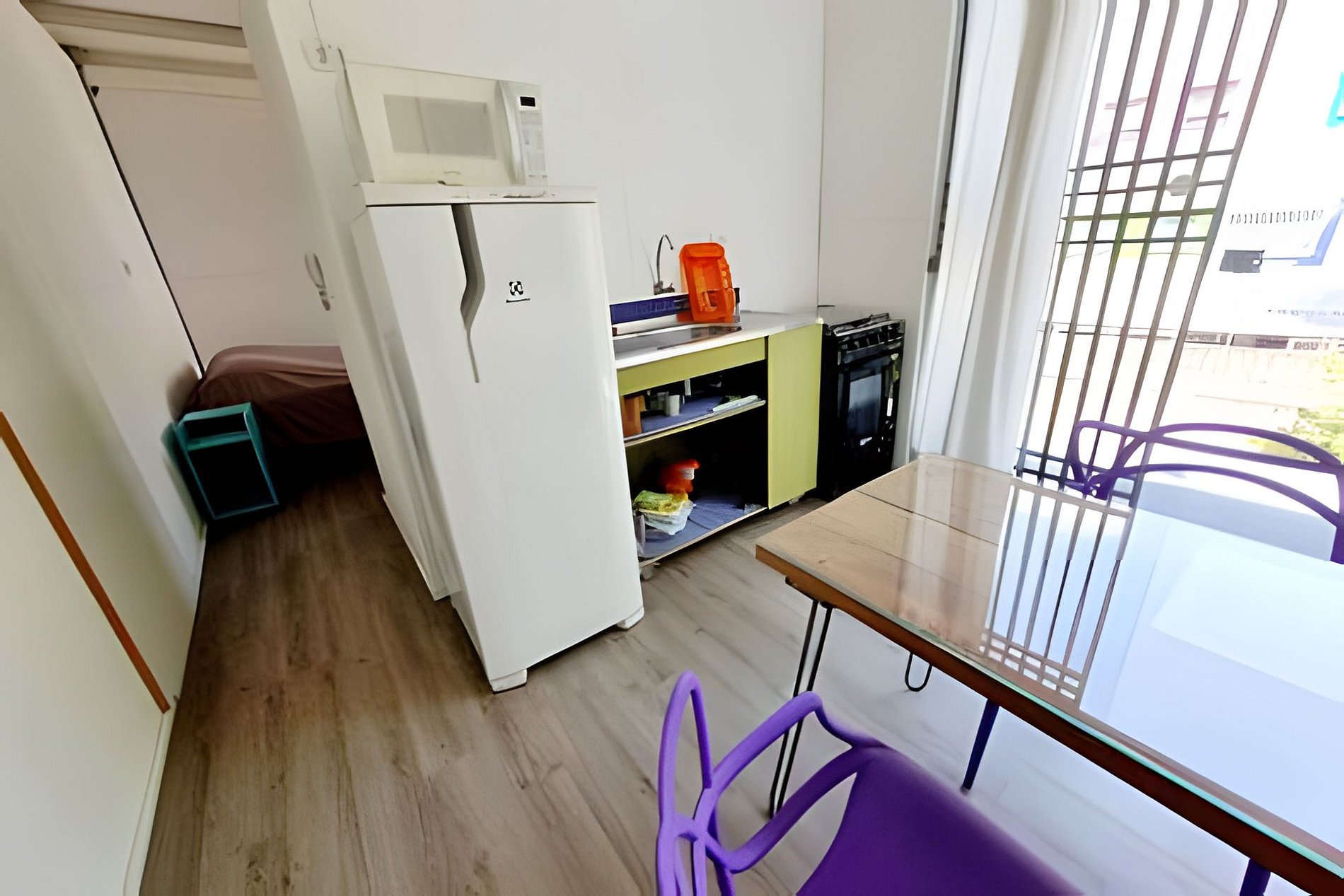 Circulação comum e apartamento com quarto, banheiro e cozinha privativos.