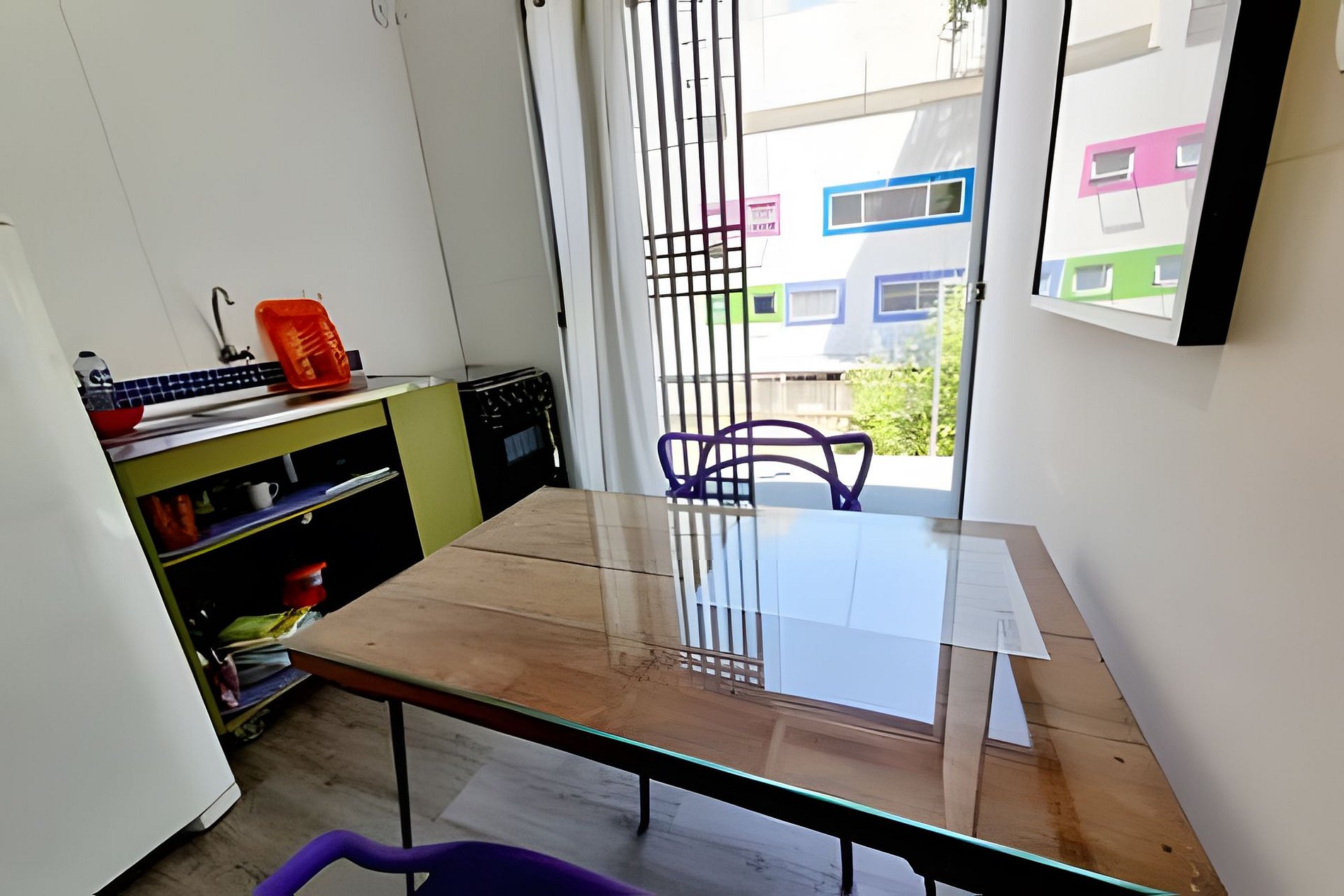 Circulação comum e apartamento com quarto, banheiro e cozinha privativos.