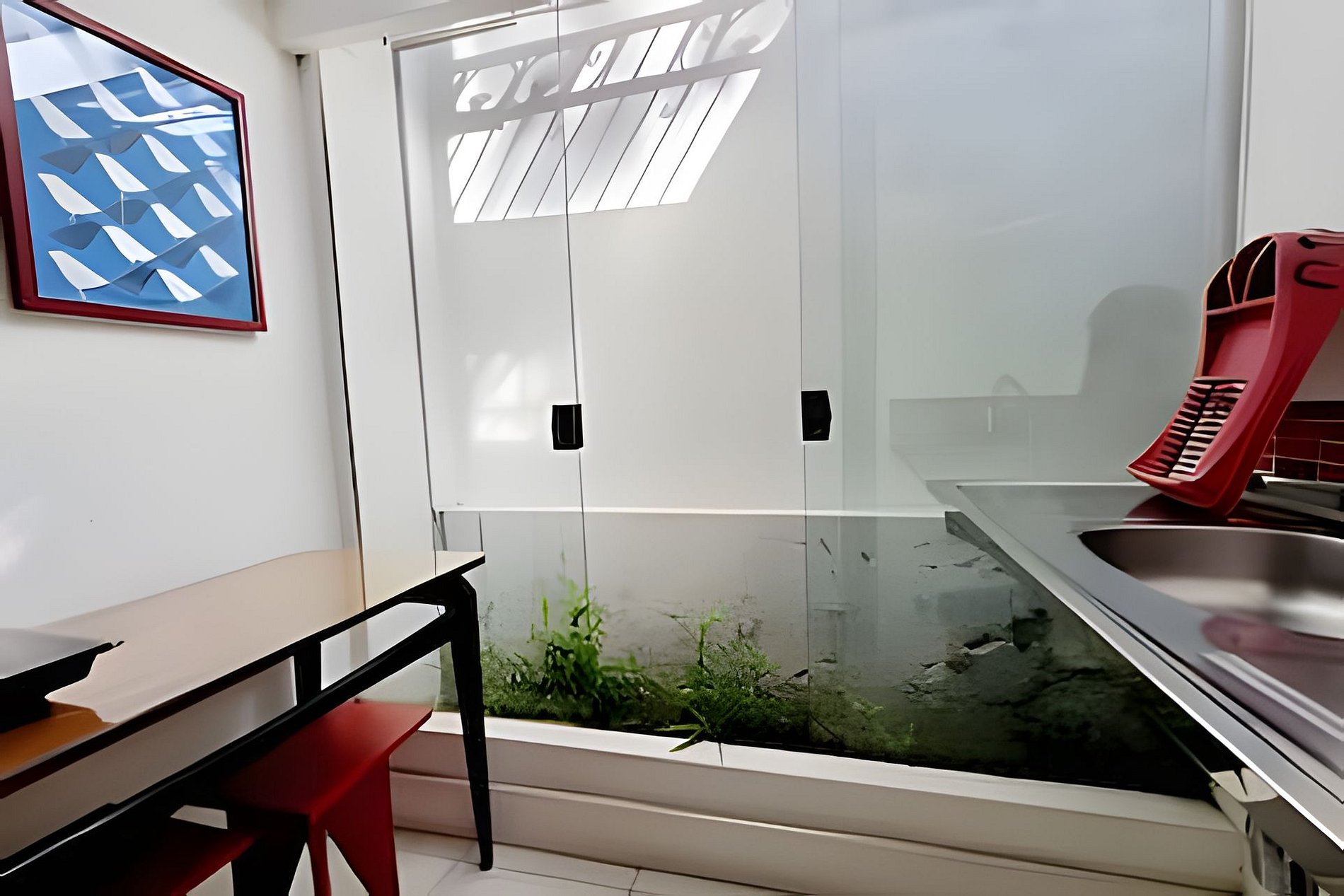 A cozinha do Estúdio 2 é uma área aberta coberta, sob cobertura de acrílico e árvore. Necessário manter a limpeza entre muro e porta de vidro para evitar insetos. Pode ser solicitada aos anfitriões sempre que o hóspede achar necessário.
