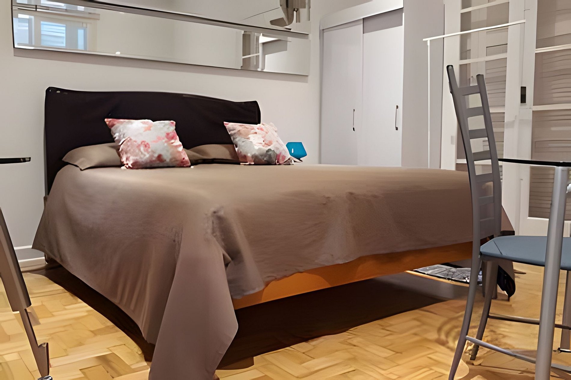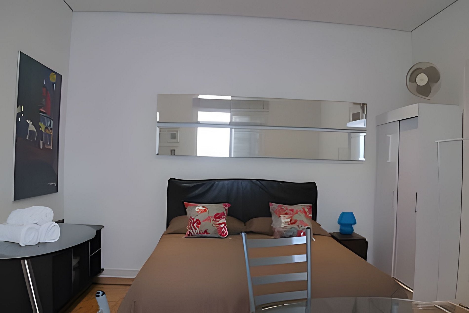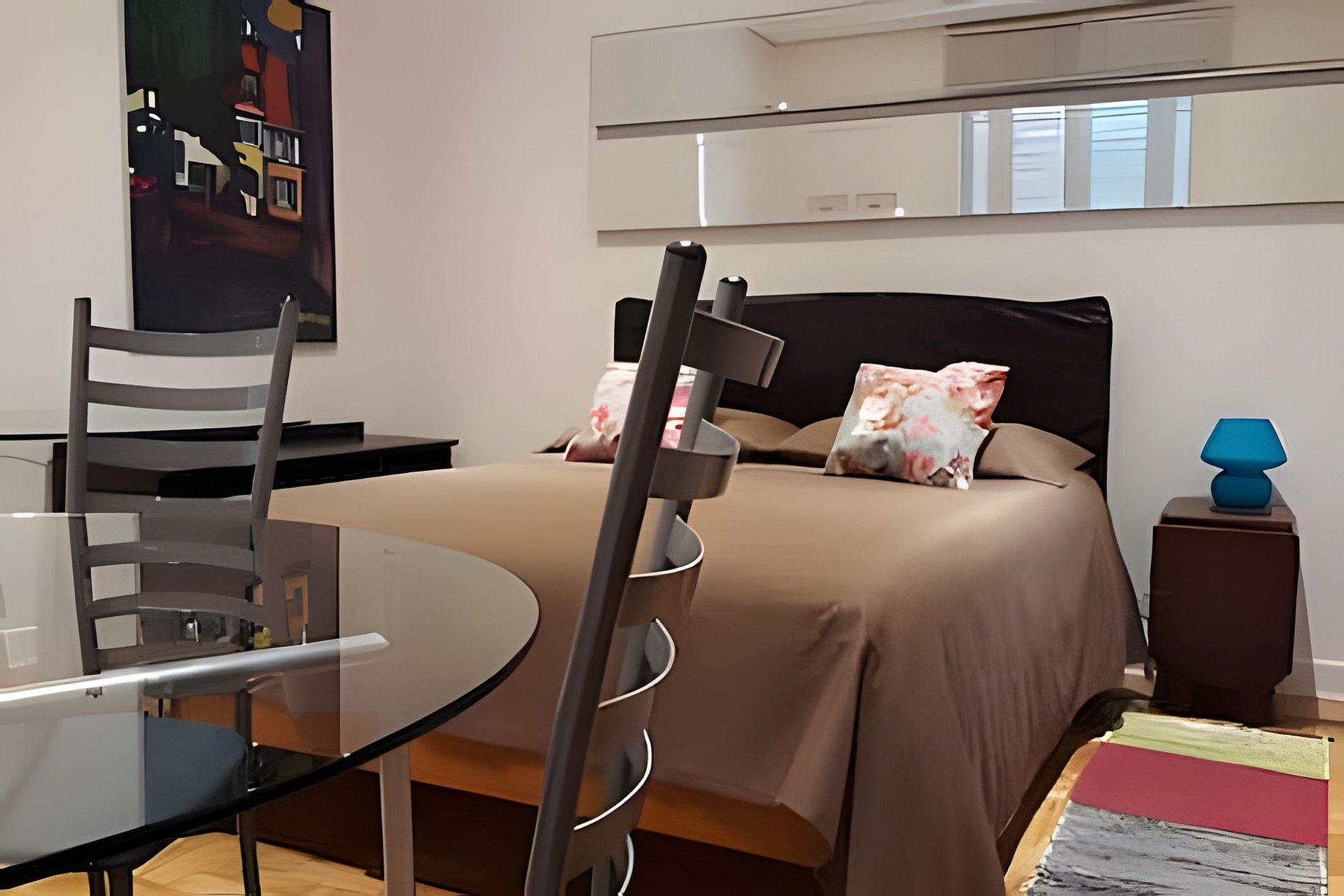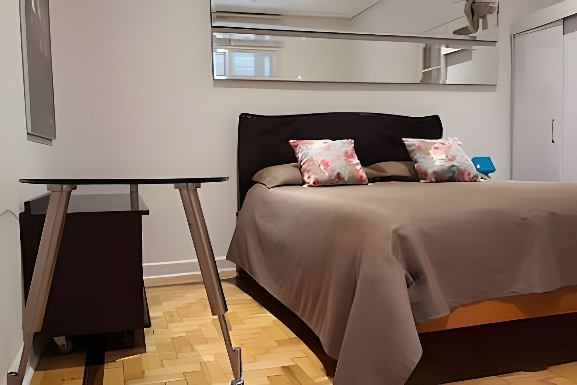 O espaço conta com um quarto muito amplo, mesa de trabalho, guarda-roupa, tv e cama queen, uma cozinha com geladeira, microondas, cooktop e utensílios e um banheiro.